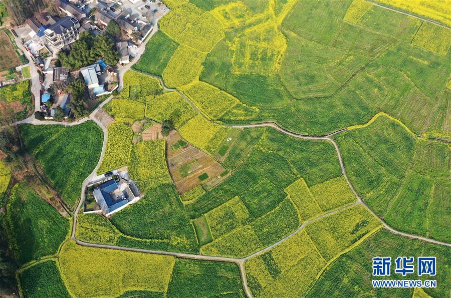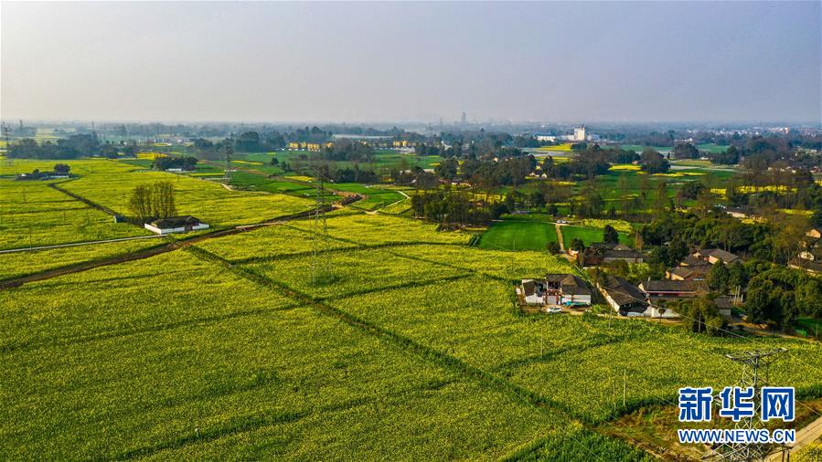 2月25日在四川省崇州市农业产业功能区拍摄的油菜花田(无人机照片)。 初春时节,正值农时。成都平原西部的大邑、崇州等县市油菜长势良好,一片生机盎然的景象。 新华社记者 王曦 摄