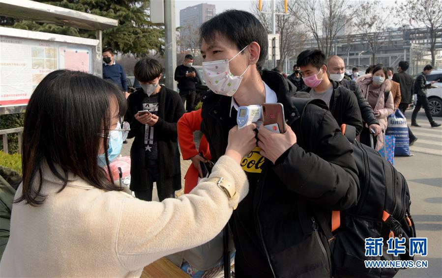 2月25日,西安比亚迪高新工业园新招聘的员工在入园前测量体温。 新华社记者 刘潇 摄