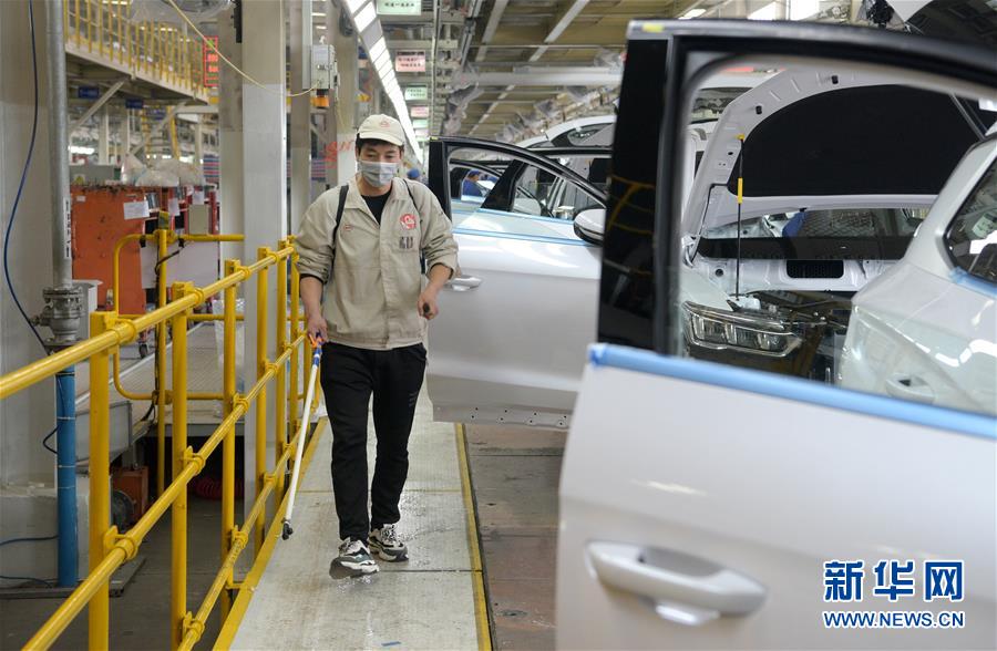 2月25日,工作人员在比亚迪西安新能源产业基地汽车总装生产线上进行消杀作业。 新华社记者 刘潇 摄