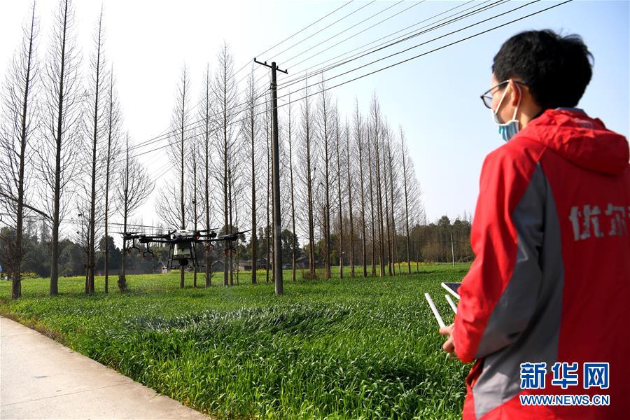 2月25日,在四川省崇州市崇庆街道红桥村,技术人员操作农业植保无人机为冬小麦喷洒农药。 新华社记者 王曦 摄