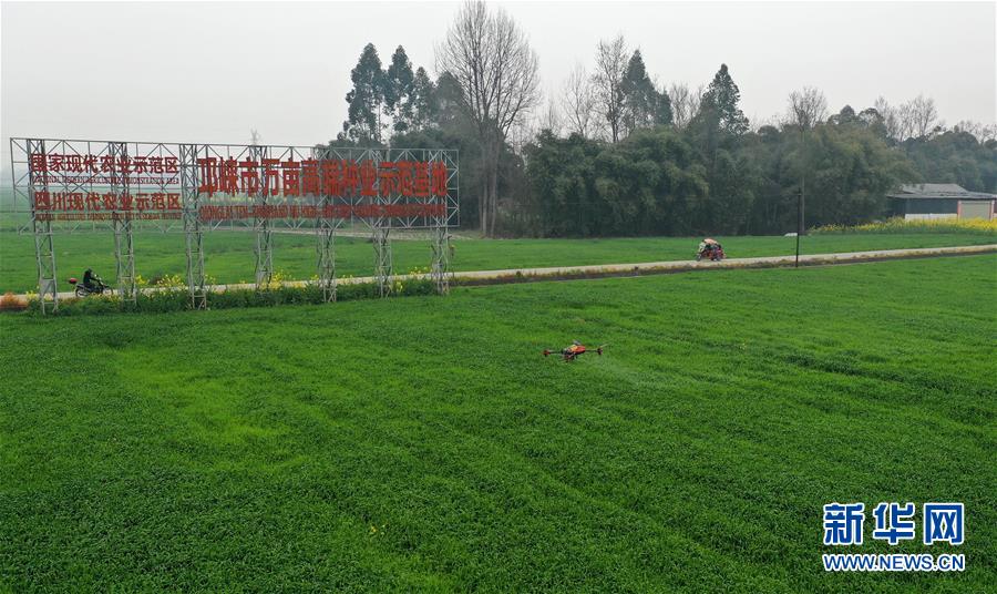 2月24日,在四川省邛崃市固驿镇,农业植保无人机为冬小麦喷洒农药(无人机照片)。 新华社记者 王曦 摄