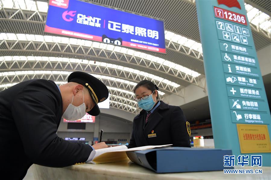 车琦(左)在南昌站登记旅客遗失物品的信息(2月7日摄)。新华社记者彭昭之摄