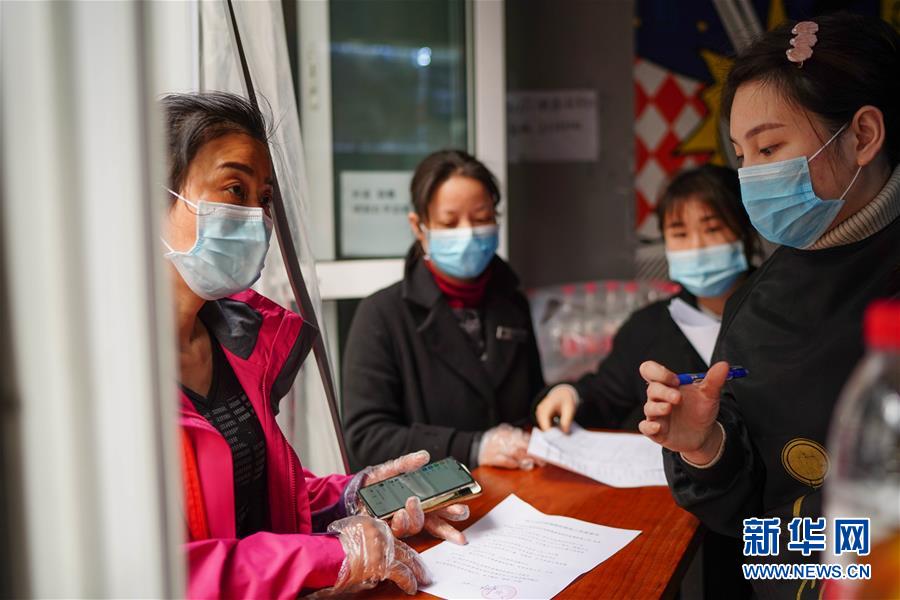 徐晓琳(左一)对社区内一家刚恢复营业的餐饮店进行检查(2月26日摄)。新华社记者周密摄