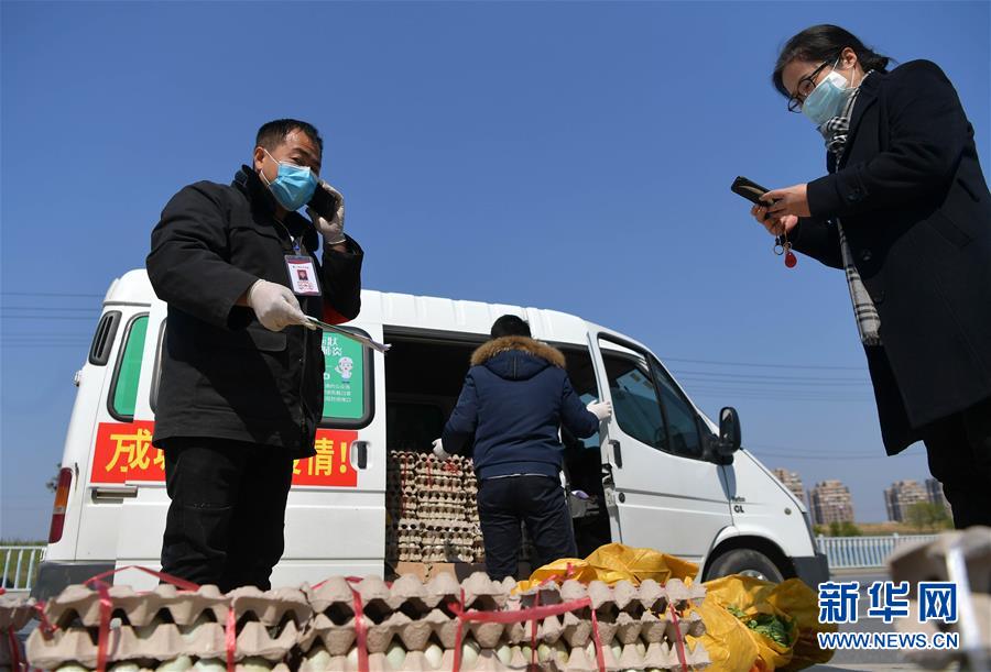 应文伟(左)将村民的蔬菜和鸭蛋送进城(2月20日摄)。新华社记者彭昭之摄