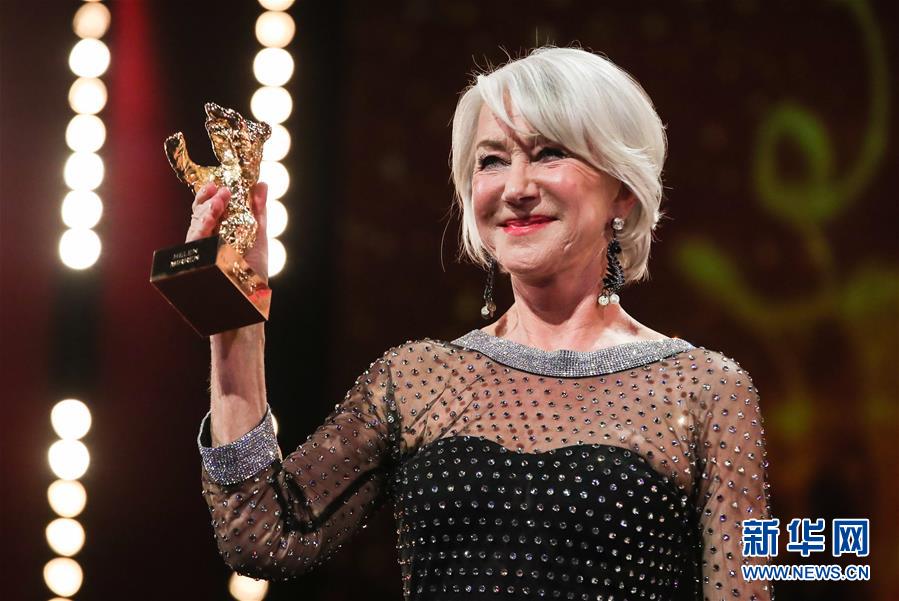 2月27日,在德国首都柏林,英国演员海伦·米伦在颁奖仪式上捧起奖杯。新华社记者单宇琦摄