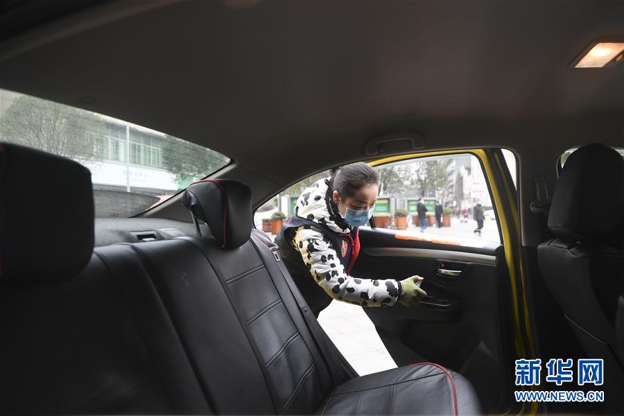 2月26日,“雷锋的士”志愿者江智琼给出租车消毒。新华社记者王全超摄