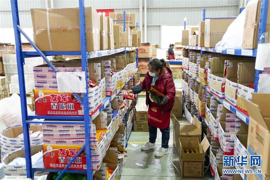 2月27日,在秀山(武陵)现代物流园区的电商云仓内,工人在按照订单配货。地处重庆市秀山县的秀山(武陵)现代物流园区,是渝湘黔三省市交界地区的区域性物流中心。重庆市秀山县在做好新冠肺炎疫情防控工作前提下,当地政府积极帮助电商、物流企业解决招工、运输、销售等方面的实际问题,推动秀山(武陵)现代物流园区快速进入全面复工复产阶段。据介绍,随着物流园区的电商和物流企业全面复工复产,既满足当地群众的物资供应,又帮助当地农产品通过电商平台实现快速销售。新华社记者刘潺摄