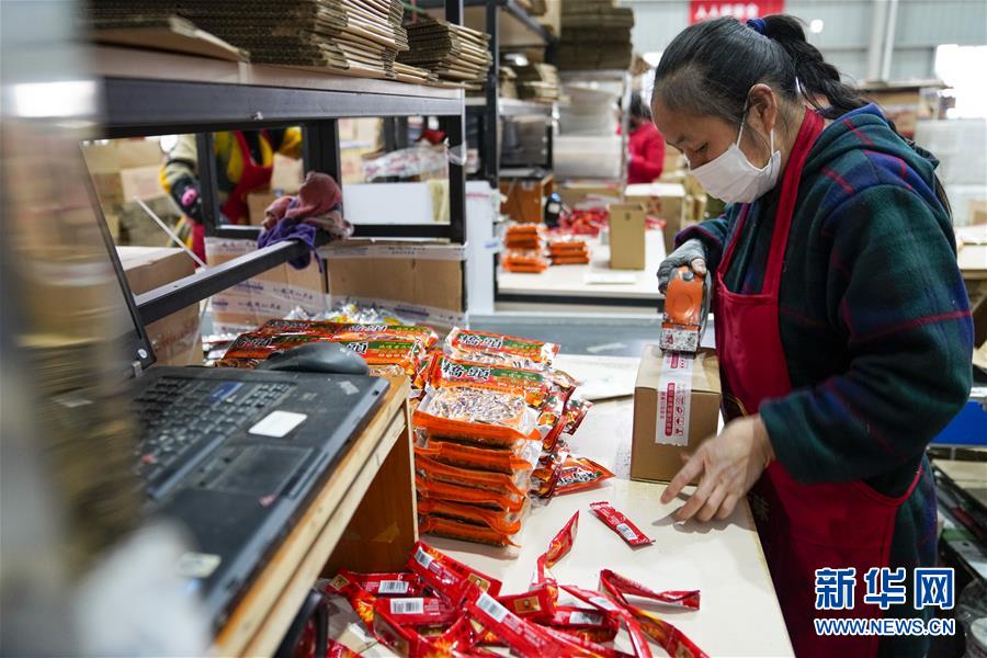 2月27日,在秀山(武陵)现代物流园区的电商云仓内,工人在打包包裹。地处重庆市秀山县的秀山(武陵)现代物流园区,是渝湘黔三省市交界地区的区域性物流中心。重庆市秀山县在做好新冠肺炎疫情防控工作前提下,当地政府积极帮助电商、物流企业解决招工、运输、销售等方面的实际问题,推动秀山(武陵)现代物流园区快速进入全面复工复产阶段。据介绍,随着物流园区的电商和物流企业全面复工复产,既满足当地群众的物资供应,又帮助当地农产品通过电商平台实现快速销售。新华社记者刘潺摄