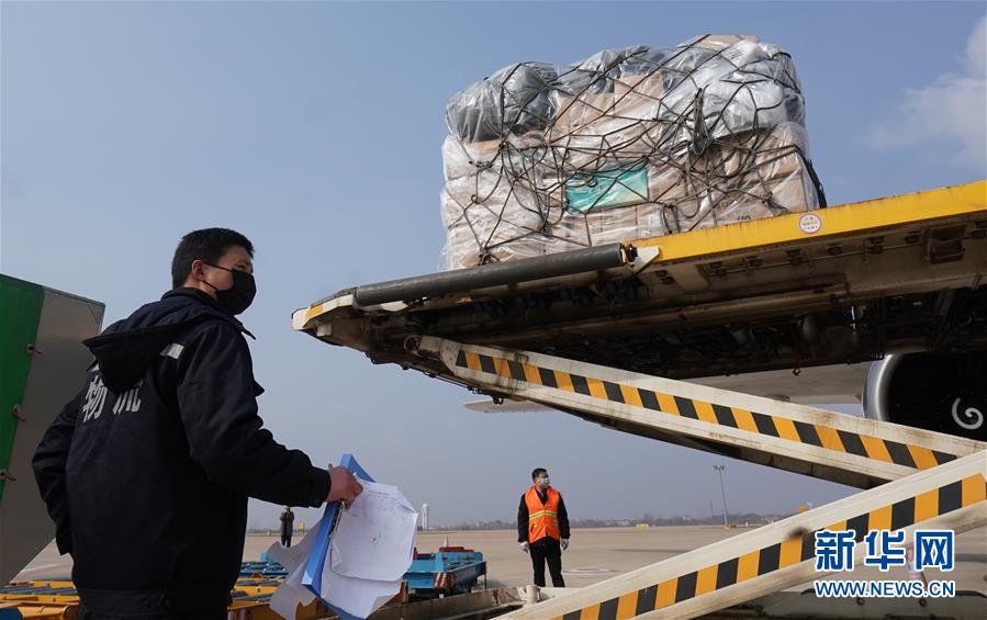 1月28日,满载医疗防疫物资的货运飞机在武汉天河机场卸货。新华社记者 程敏 摄