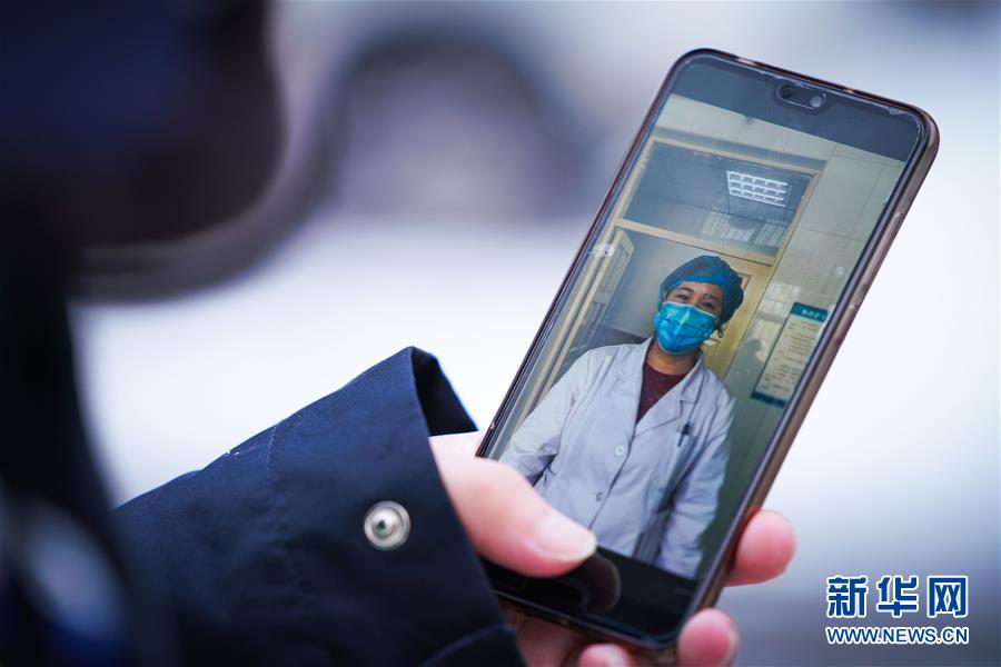 李可心展示手机里母亲王晶的工作照(3月1日摄)。母亲王晶是一名医生,疫情期间在留观病房工作。 新华社记者王松摄