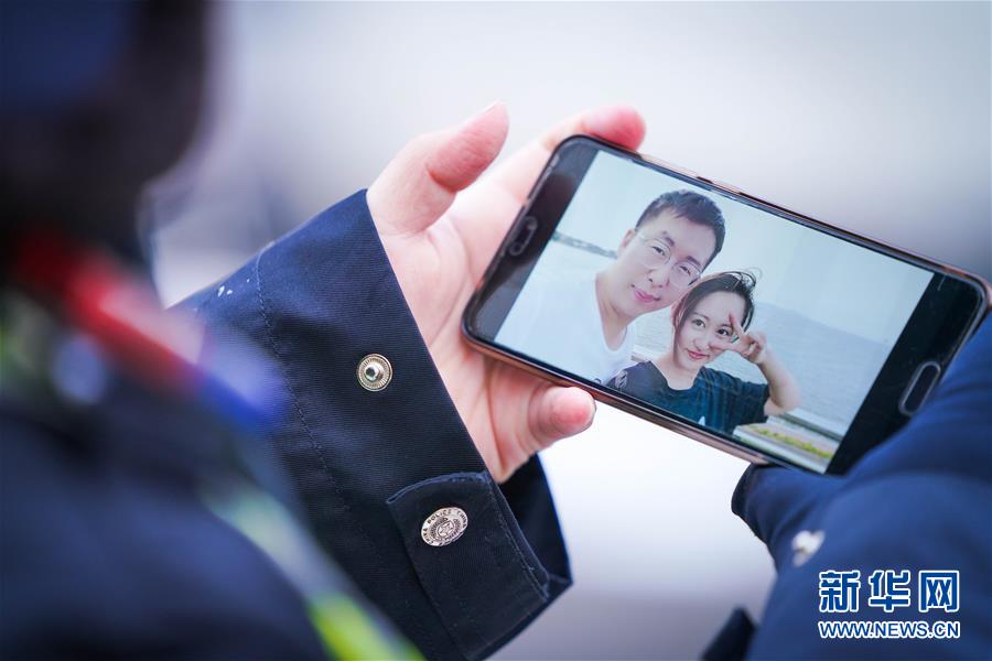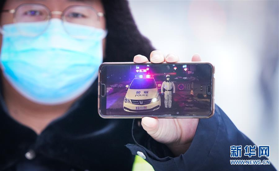 李可心展示手机里父亲李论的工作照(3月1日摄)。父亲李论是一名民警,负责对辖区内疑似感染人员居住小区进行封控、排查工作。新华社记者王松摄