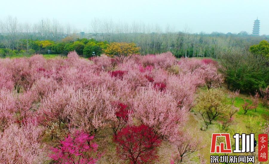 江苏省扬州市蜀冈西峰生态公园内梅花竞相绽放,五颜六色的梅花树为古城大地披上七彩春装,美不胜收。