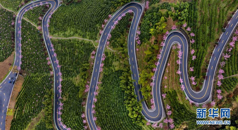 这是3月2日拍摄的平利县长安镇洪福茶山,道路两旁的春梅盛开(无人机照片)。新华社记者陶明摄