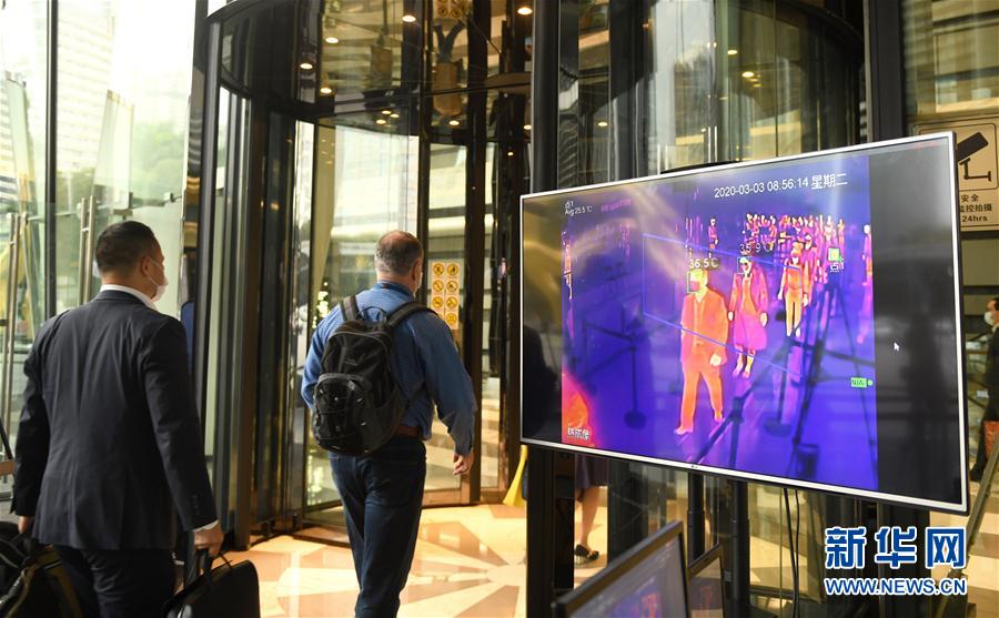 3月3日,进入广州国际金融中心的人们排队通过红外测温仪。 新华社记者 卢汉欣 摄