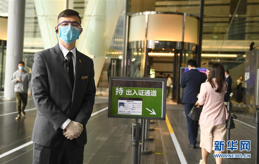 3月3日,在广州国际金融中心楼下,办好出入证件的人员从持证通道进入大楼。 新华社记者 卢汉欣 摄
