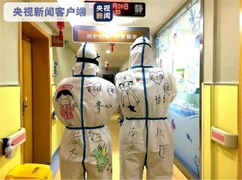 “防护服上画漫画,小朋友们乐开花,打针治疗不再怕,打败病魔早回家!”