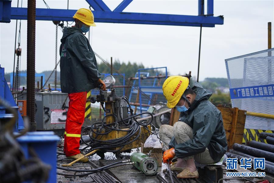 3月4日,工人在融河高速公路融江特大桥施工现场作业。近日,广西融水苗族自治县至河池市高速公路(融河高速公路)相关建设单位在做好疫情防控的同时,抓紧复产复工,目前工程复工率已超过80%。新华社记者杨驰摄