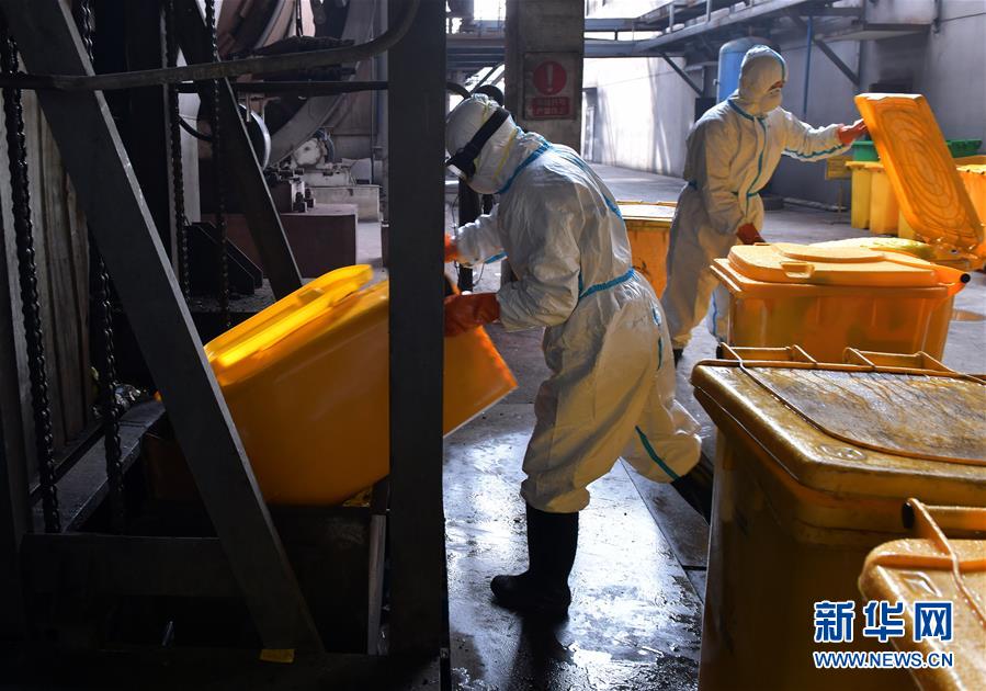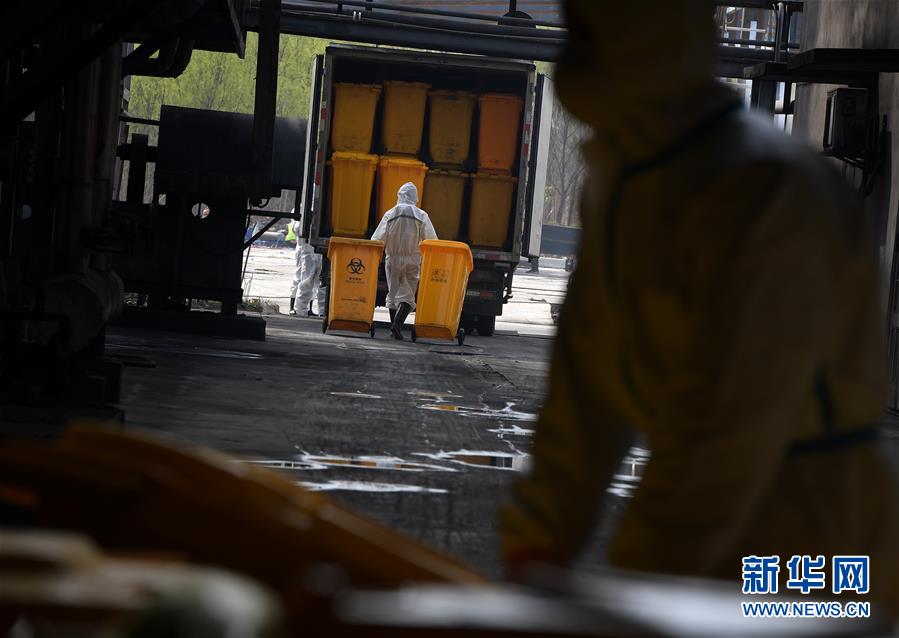 3月4日,在武汉市青山区云峰公司,工作人员将医疗垃圾投入斗提机进行焚烧。新华社记者 李贺 摄