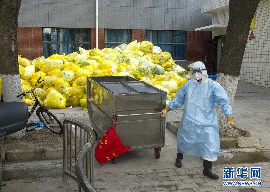 2月19日,在武汉市协和医院西院区,工作人员在转运医疗垃圾。新华社记者 才扬 摄