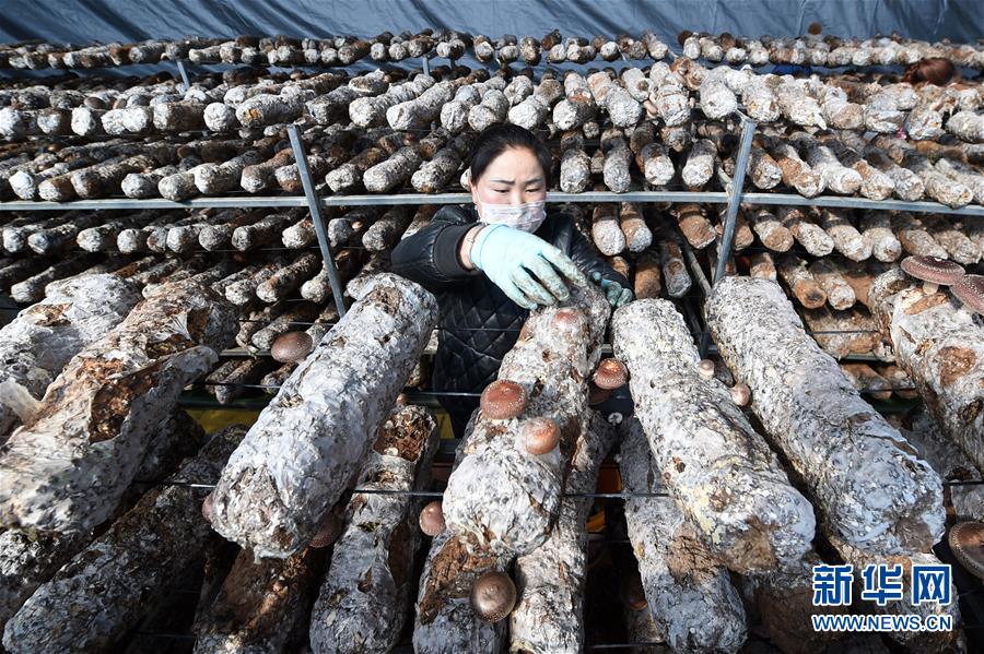 3月4日,在靖远县石门乡路庄村易地扶贫搬迁搬入地——三滩镇银滩村,农民在香菇大棚里采摘香菇。