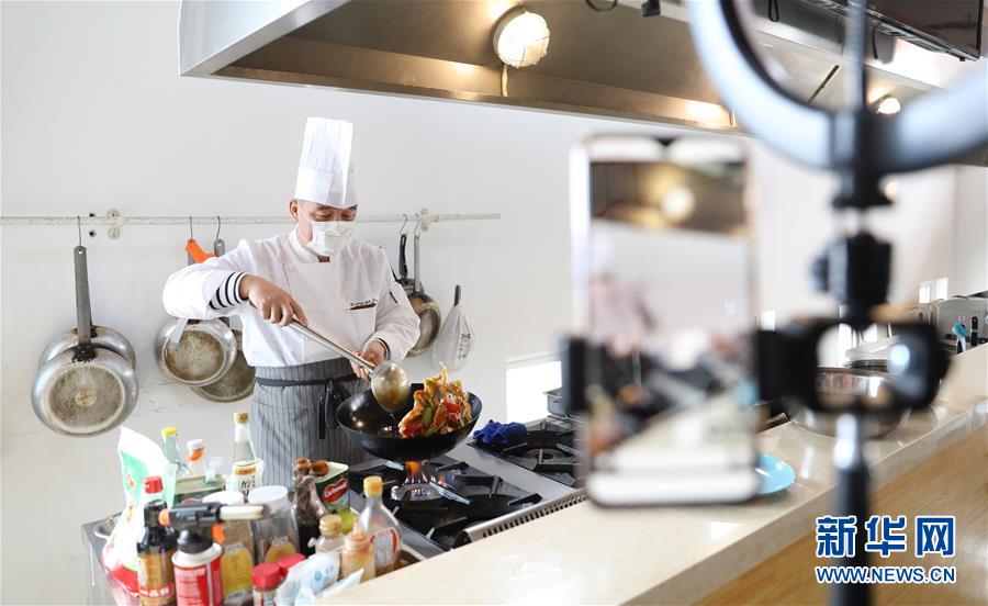3月4日,职教城内的鞍山市现代服务学校的李崇老师为学生进行辽菜烹饪实训网络授课。辽宁省鞍山市职教城内的各类职业教育学校从3月2日恢复网络授课以来,教师们设置了丰富多彩的课程,提高1万余名学生线上学习的积极性。新华社记者 姚剑锋摄
