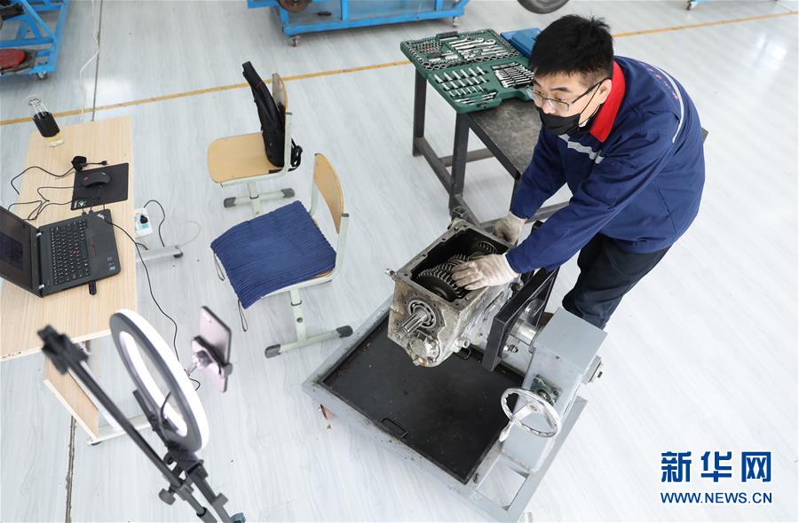 3月4日,职教城内的鞍山市交通运输学校的高峰老师为学生进行变速器检修实训网络授课。辽宁省鞍山市职教城内的各类职业教育学校从3月2日恢复网络授课以来,教师们设置了丰富多彩的课程,提高1万余名学生线上学习的积极性。新华社记者姚剑锋 摄