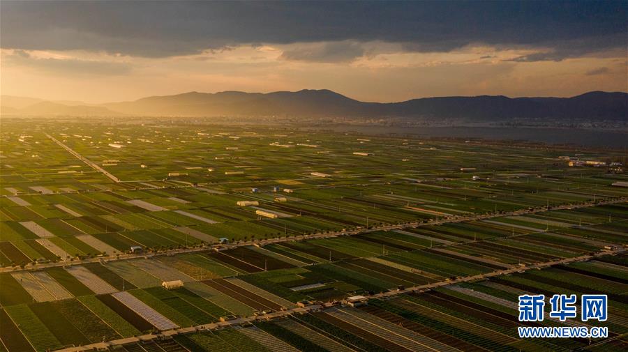 时下正值农忙时节,云南省玉溪市通海县的农作物长势喜人,山峦、湖水与农田组成了一幅美丽的田园诗画卷。