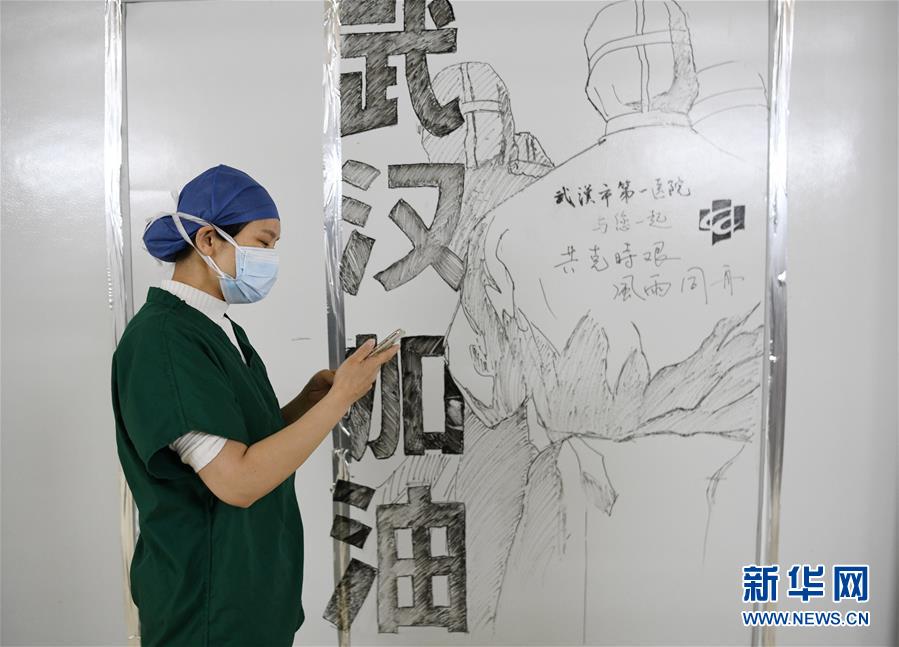 3月4日,在武汉雷神山医院,来自武汉第一医院的陈娅莉拍摄同事的图画。雷神山医院建成后,各地医疗队进驻这里,全力以赴救治患者。雷神山医院走道间的墙,逐渐成为医护人员和工作人员表达内心感受的窗口,他们在此画画、写字……温情的笔触、有力的画笔,寄托了美好的祝愿,也展示了他们战胜疫情的信念与决心!新华社记者 程敏 摄