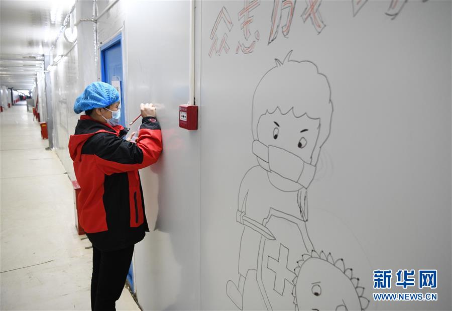 3月4日,在武汉雷神山医院,来自金域医学的陈丹在画画。雷神山医院建成后,各地医疗队进驻这里,全力以赴救治患者。雷神山医院走道间的墙,逐渐成为医护人员和工作人员表达内心感受的窗口,他们在此画画、写字......温情的笔触、有力的画笔,寄托了美好的祝愿,也展示了他们战胜疫情的信念与决心!新华社记者 程敏 摄