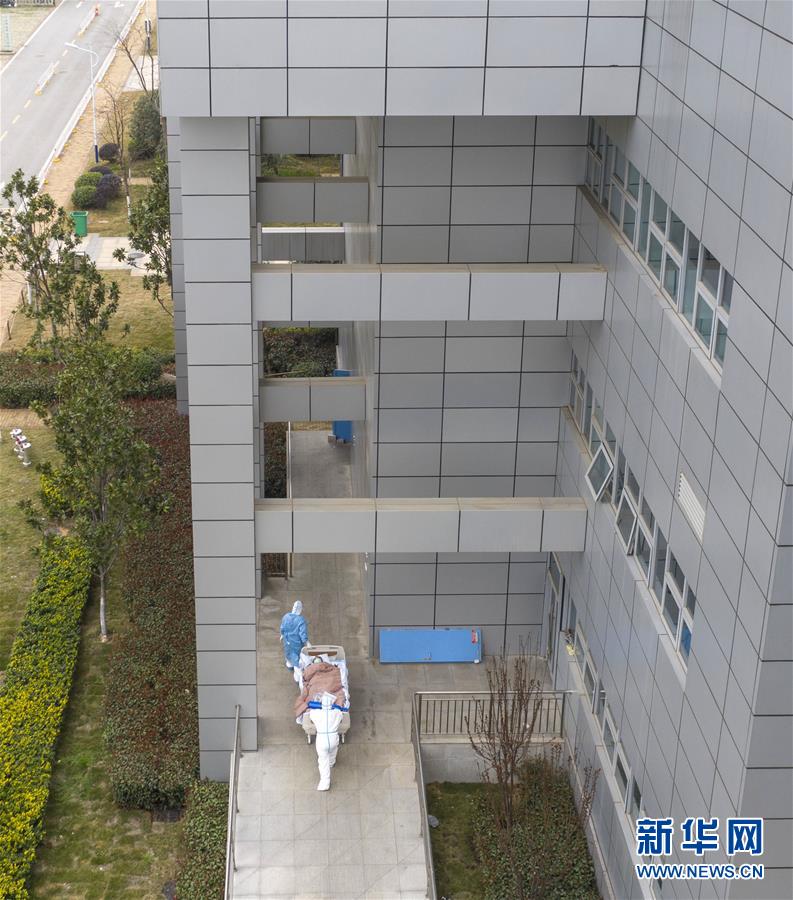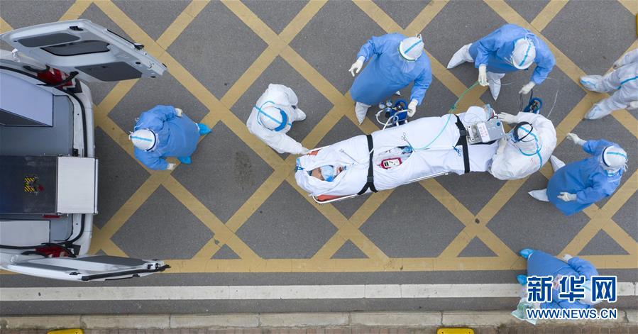3月6日,在华中科技大学附属同济医院中法新城院区,医护人员护送一名新冠肺炎患者去做CT检查(无人机照片)。新华社记者才扬摄