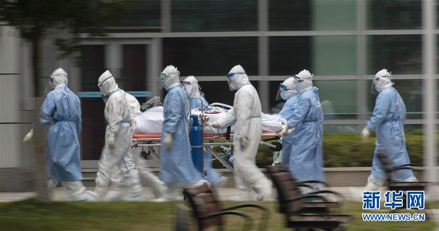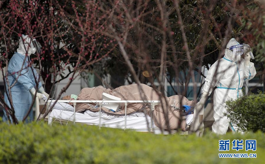 3月6日,在华中科技大学附属同济医院中法新城院区,医护人员护送一名新冠肺炎患者去做CT检查。新华社记者费茂华摄