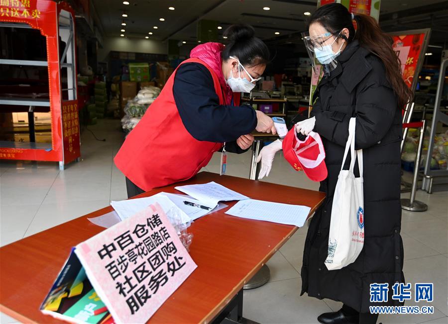 3月7日,工作人员给刚到达武汉中百仓储百步亭花园路店的郑欣怡量体温。新华社记者陈晔华摄