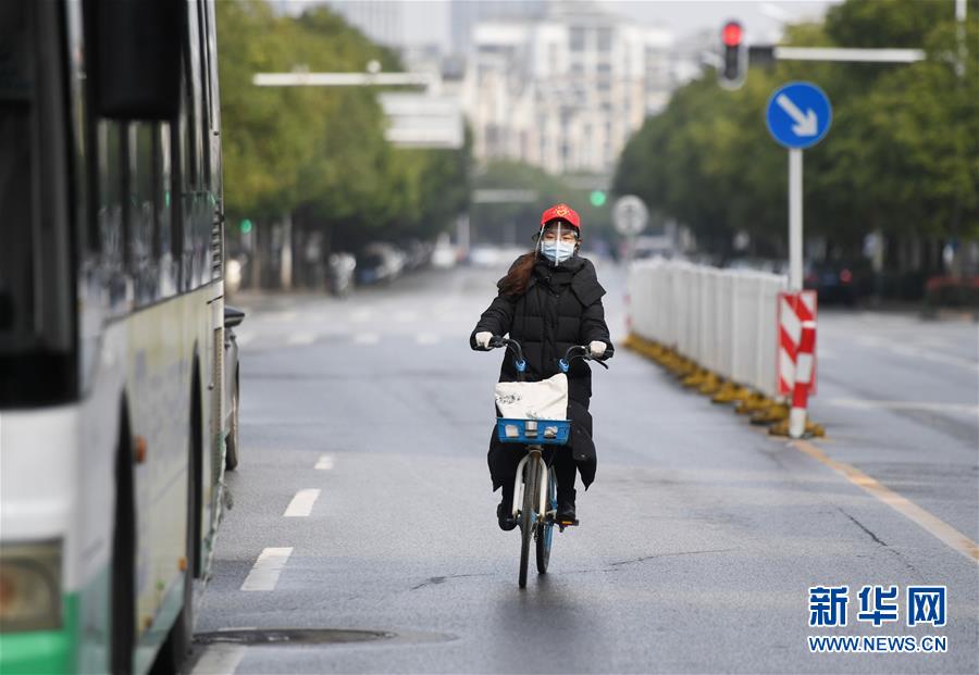 3月7日,郑欣怡骑共享单车前往武汉中百仓储百步亭花园路店做志愿服务。新华社记者陈晔华摄
