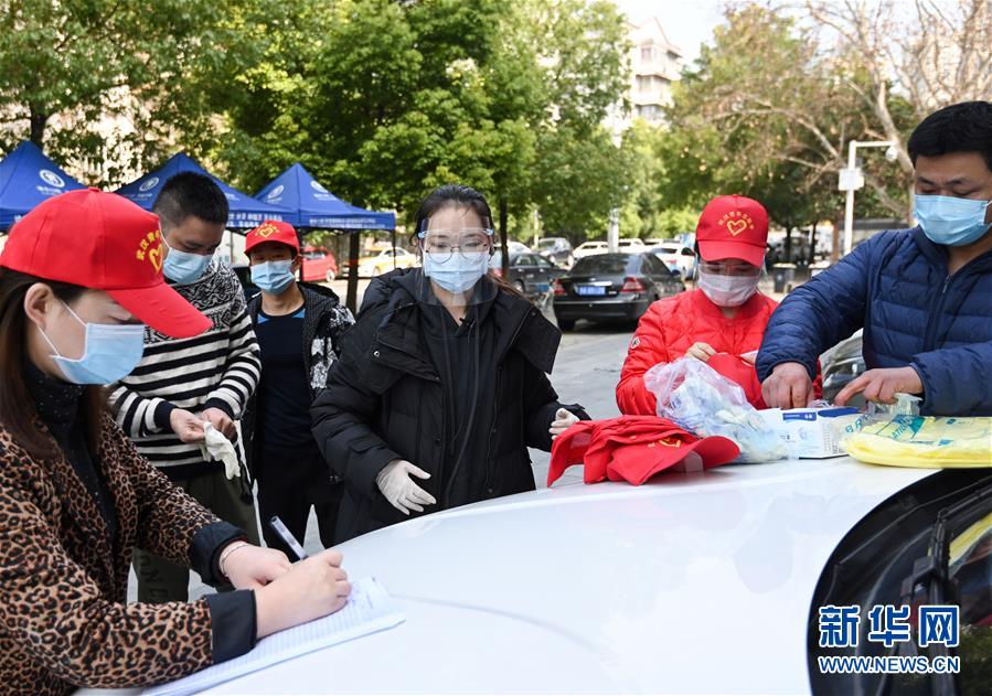 3月7日,郑欣怡(中)在武汉中百仓储百步亭花园路店外给其他志愿者分发防护用品。新华社记者陈晔华摄