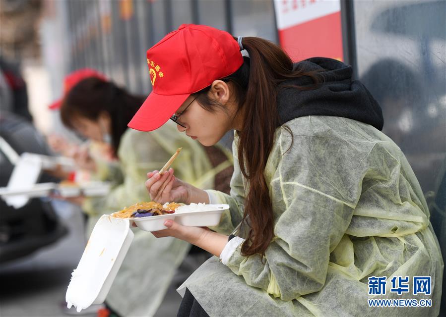 3月7日,郑欣怡在武汉中百仓储百步亭花园路店外吃午饭。新华社记者陈晔华摄