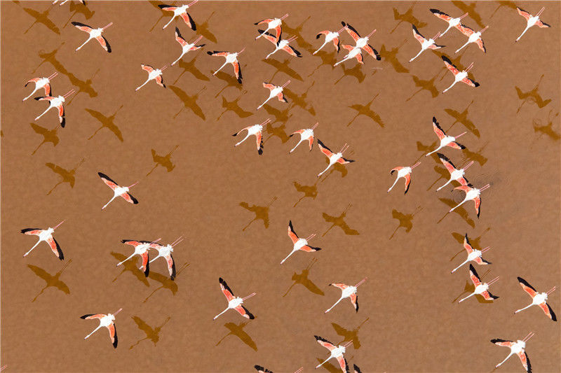 2018年1月9日讯(具体拍摄时间不详), 西班牙卡迪兹海湾,数百只粉红色的火烈鸟飞过五颜六色的盐沼,在水面上形成令人惊叹的倒影。太阳落山时分,摄影师Oscar Diez在300米高空的飞机上拍下这些令人震撼的照片。Oscar Diez/Solent News/视觉中国