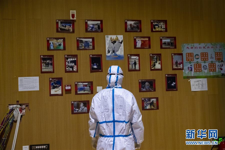 3月9日晚,在武汉市洪山体育馆武昌方舱医院,名叫管茜的医务人员查看贴有该方舱里的新冠肺炎患者和医务人员照片的照片墙。新华社记者沈伯韩摄