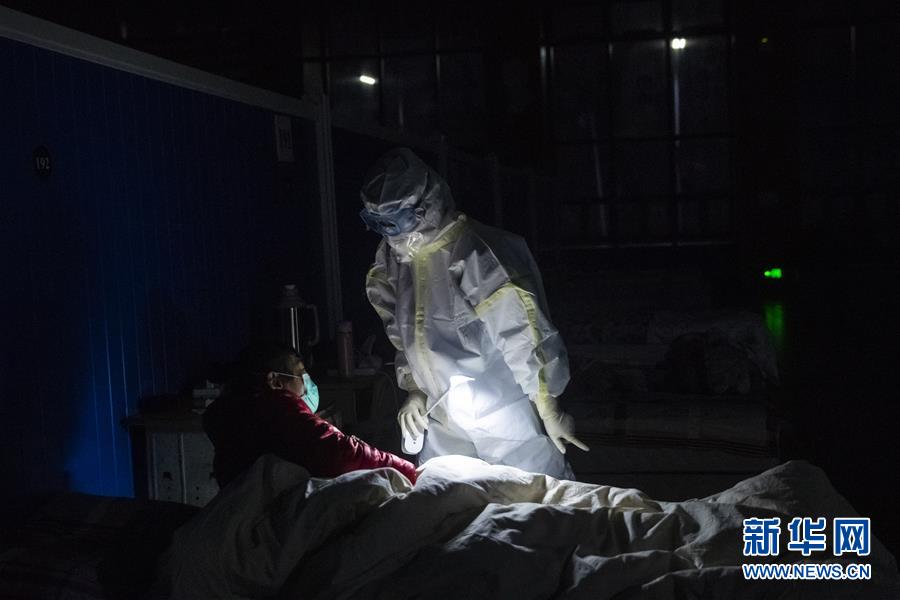 3月9日晚,在位于武汉市洪山体育馆的武昌方舱医院,江西支援湖北医疗队队员胡佩在熄灯后巡视。新华社记者沈伯韩摄