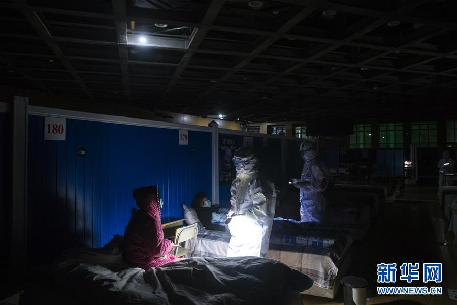 3月9日晚,在位于武汉市洪山体育馆的武昌方舱医院,江西支援湖北医疗队队员胡佩(右二)和杨成(右一)在熄灯后巡视。新华社记者沈伯韩摄