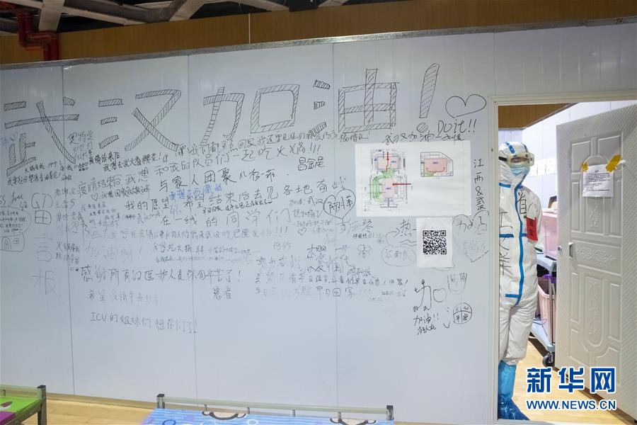 3月9日晚,在武汉市洪山体育馆武昌方舱医院,医生江文洋站在一片留言板旁看着方舱里的“战友”和“病友”们。新华社记者沈伯韩摄