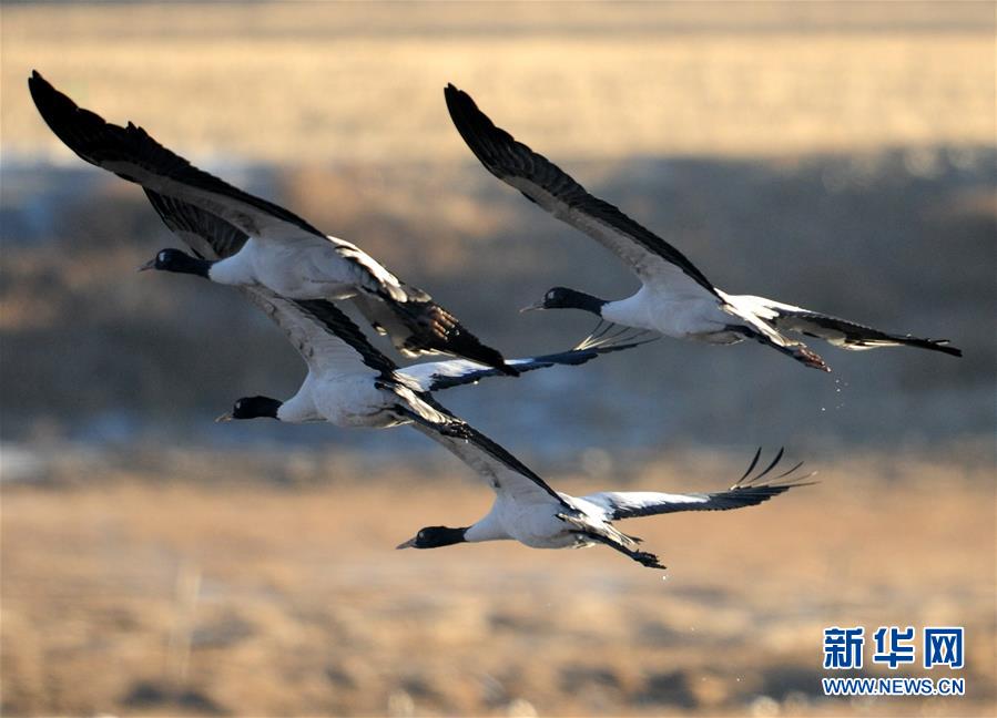 黑颈鹤在青藏高原翱翔(2013年12月5日摄)。新华社记者陈天湖摄