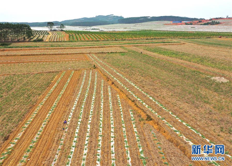3月11日,农民在广西南宁市江南区延安镇管护农作物(无人机照片)。 近日,随着气温的回升,广西南宁市江南区群众抓紧农时,开展农田管护,田间地头一派繁忙景象。 新华社记者 周华 摄