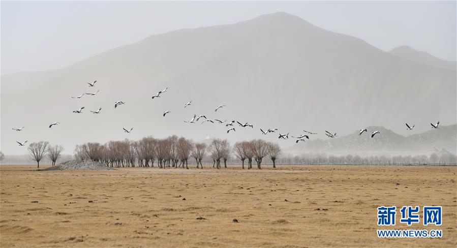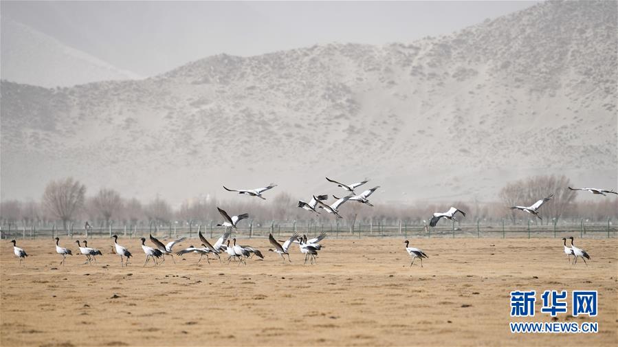 在西藏山南市境内雅鲁藏布江北岸,黑颈鹤在飞翔(3月11日摄)。 随着天气转暖,西藏雅鲁藏布江河谷地带的黑颈鹤即将结束越冬,返回藏北。 新华社记者 晋美多吉 摄