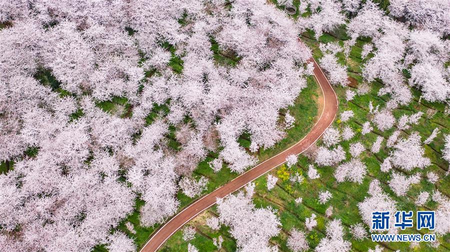3月12日拍摄的贵安新区樱花观光园风景(无人机照片)。 近日,贵州省贵安新区樱花观光园内樱花竞相盛开,花团锦簇间春意盎然。据介绍,疫情防控期间,为避免人群聚集,樱花园暂不接待游客。 新华社记者 陶亮 摄