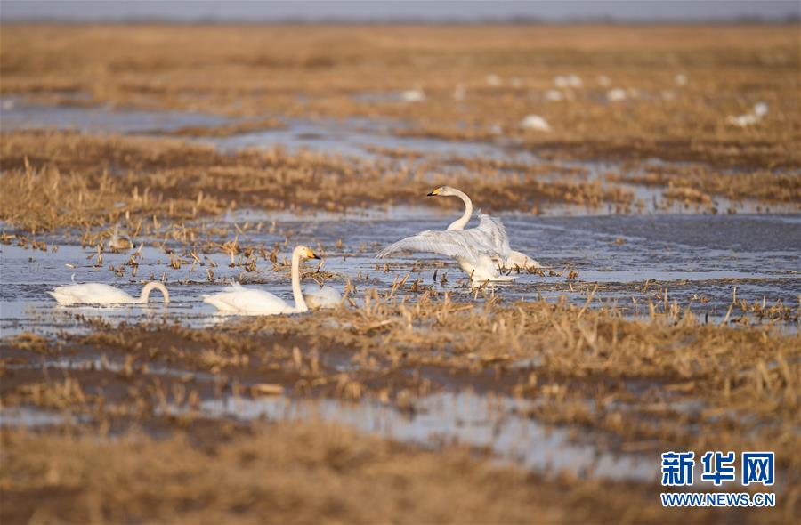 3月12日,候鸟在杭锦旗呼和木独镇黄河湿地栖息。