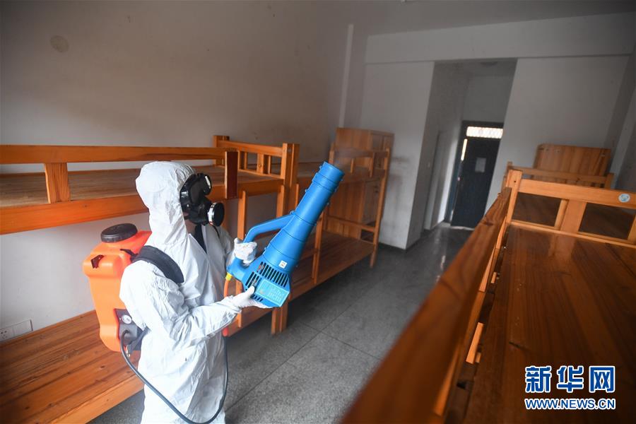 3月12日,在长沙市长雅中学,工作人员对学生宿舍进行消毒。 近日,长沙市开福区为保障疫情期间各中小学校按计划开展网上教学工作,同时为开学做好防疫准备,提前在校园中进行消毒,布置学生宿舍,安装红外线测温门,并储备消毒液、口罩、洗手液等防疫物资。 新华社记者 陈泽国 摄
