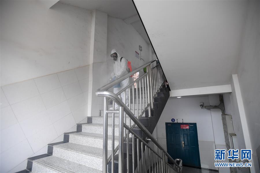 3月12日,在长沙市长雅中学,工作人员对学生宿舍楼梯间进行消毒。 近日,长沙市开福区为保障疫情期间各中小学校按计划开展网上教学工作,同时为开学做好防疫准备,提前在校园中进行消毒,布置学生宿舍,安装红外线测温门,并储备消毒液、口罩、洗手液等防疫物资。 新华社记者 陈泽国 摄
