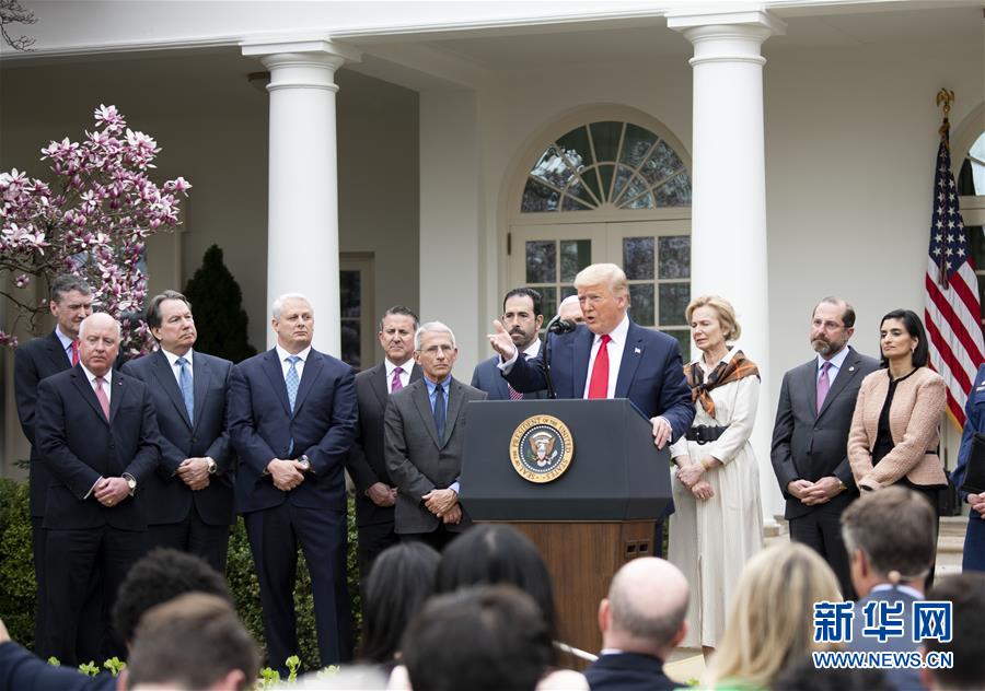 3月13日,美国总统特朗普(中)在华盛顿白宫的记者会上讲话。特朗普当天下午在白宫发表讲话时正式宣布“国家紧急状态”。他说,此举旨在让美国联邦政府全力投入到抗击新冠肺炎疫情的努力中。这项举措将释放500亿美元资金,帮助各州和地方政府应对疫情。新华社记者刘杰摄