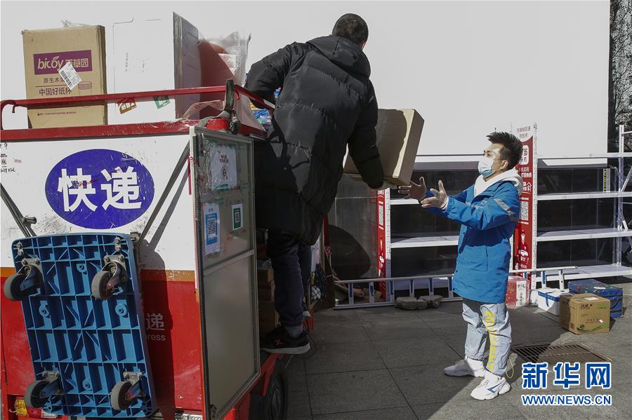 3月12日,李杰(右)在中国青年政治学院快递点帮助其他公司同行卸货。新华社记者张玉薇摄
