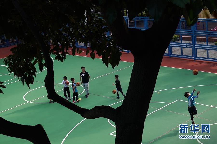 小朋友在篮球场锻炼(2月23日摄)。新华社记者李钢摄